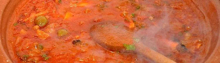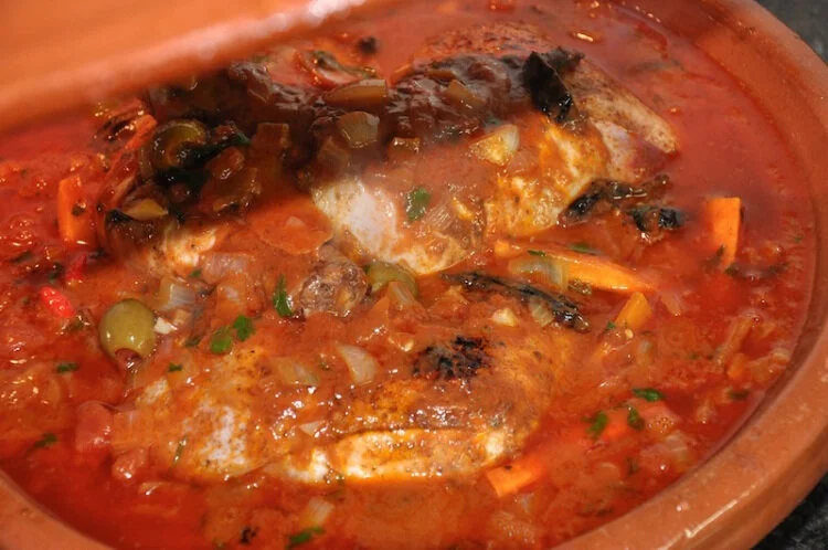 A tajine, or tagine, is a Berber dish from North Africa, that is named after the special earthenware pot in which it is cooked. The traditional tajine pot is formed entirely of a heavy clay, which is sometimes painted or glazed. It consists of two parts: a base unit that is flat and circular with low sides, and a large cone or dome-shaped cover that sits on the base during cooking. The cover is so designed to promote the return of all condensation to the bottom. With the cover removed, the base can be taken to the table for serving.